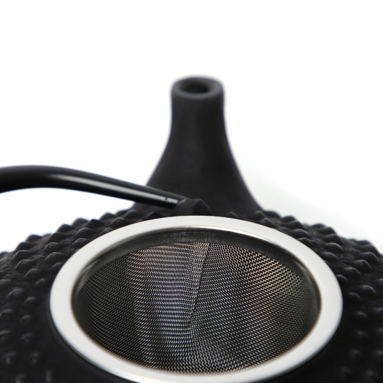 Small black cast iron Tetsu Kyusu teapot by the renowned Japanese Nanbu Tekki brand, Iwachu, with a dotted Arare pattern in a flat, wide Kambin "sake warmer" style with rust-proof enamelled interior and removable stainless steel strainer. Suitable for brewing all kinds of tea from Japanese green teas to herbal tisanes, as well as for gently warming sake.