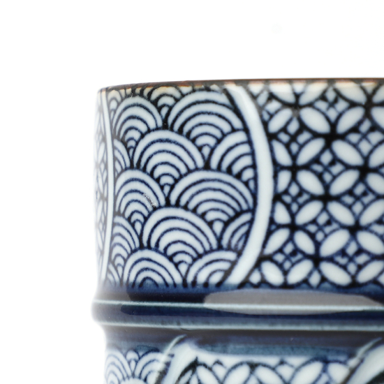 Coffret de tasses à thé composé d'une petite et d'une grande tasse. Arita-Yaki original de Saga, Japon, avec motif traditionnel bleu fluide Shonzui (祥瑞).