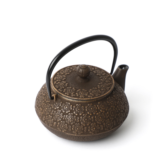 Théière en fonte japonaise Tetsu-Kyusu fabriquée par le fabricant traditionnel japonais Iwachu. Chef-d'œuvre fait à la main, couleur café doré. Bouilloire pour faire bouillir de l'eau pour le thé et le café, émaillée, modèle Sakura (fleur de cerisier japonais / 桜), 650 ml.