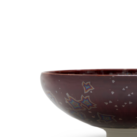 Außergewöhnliche, in Kyoto handgefertigte Matcha Chawan mit faszinierender kaleidoskopischer, kristalliner Glasur und rotem Metallglanz. Die breite, flach gestaltete Schale im Hira-Stil sorgt für schnelles Abkühlen des Matcha darin und ist damit speziell für die Verwendung bei Sommer- und Nodate-Teezeremonien im Freien gedacht.